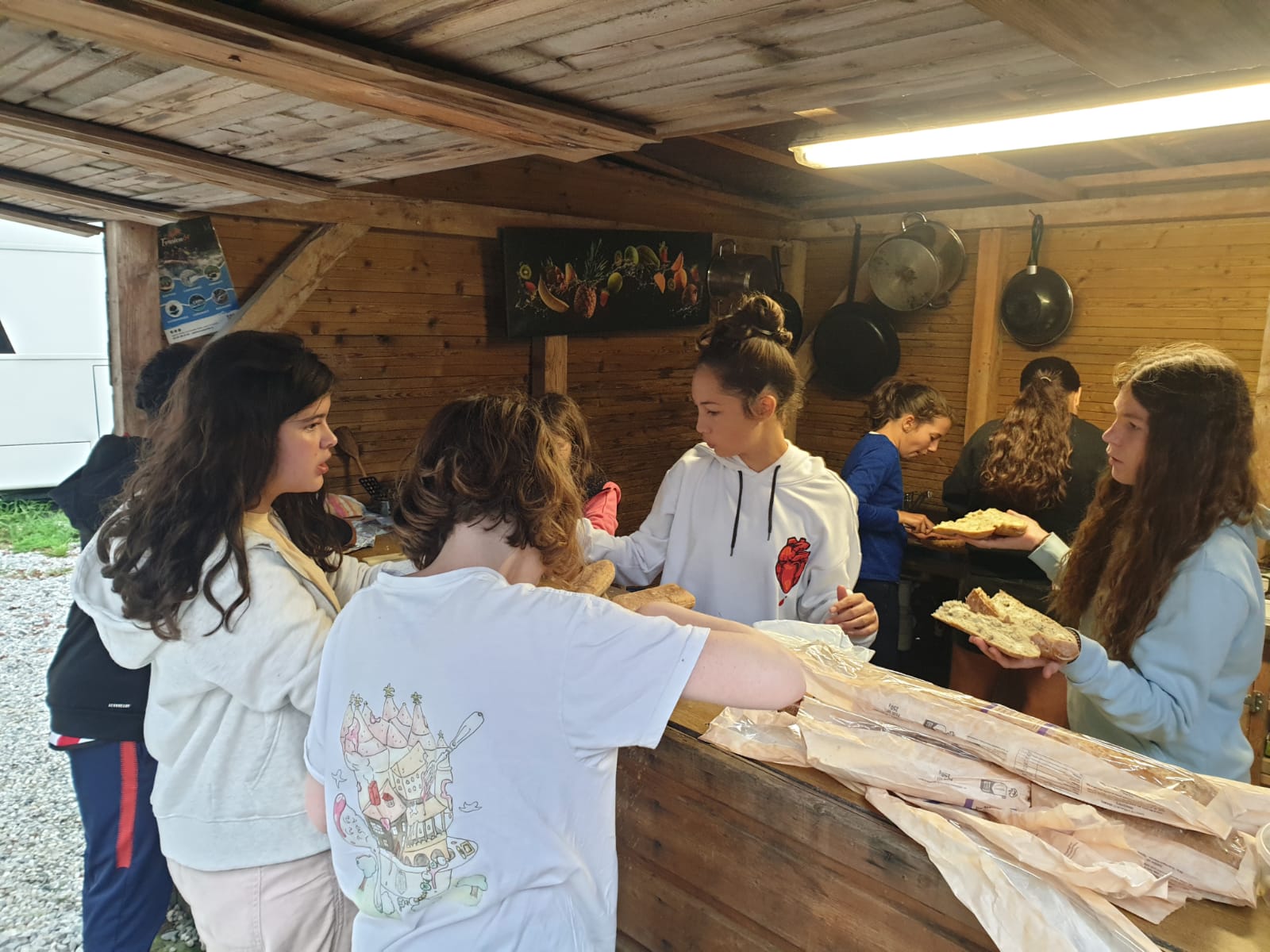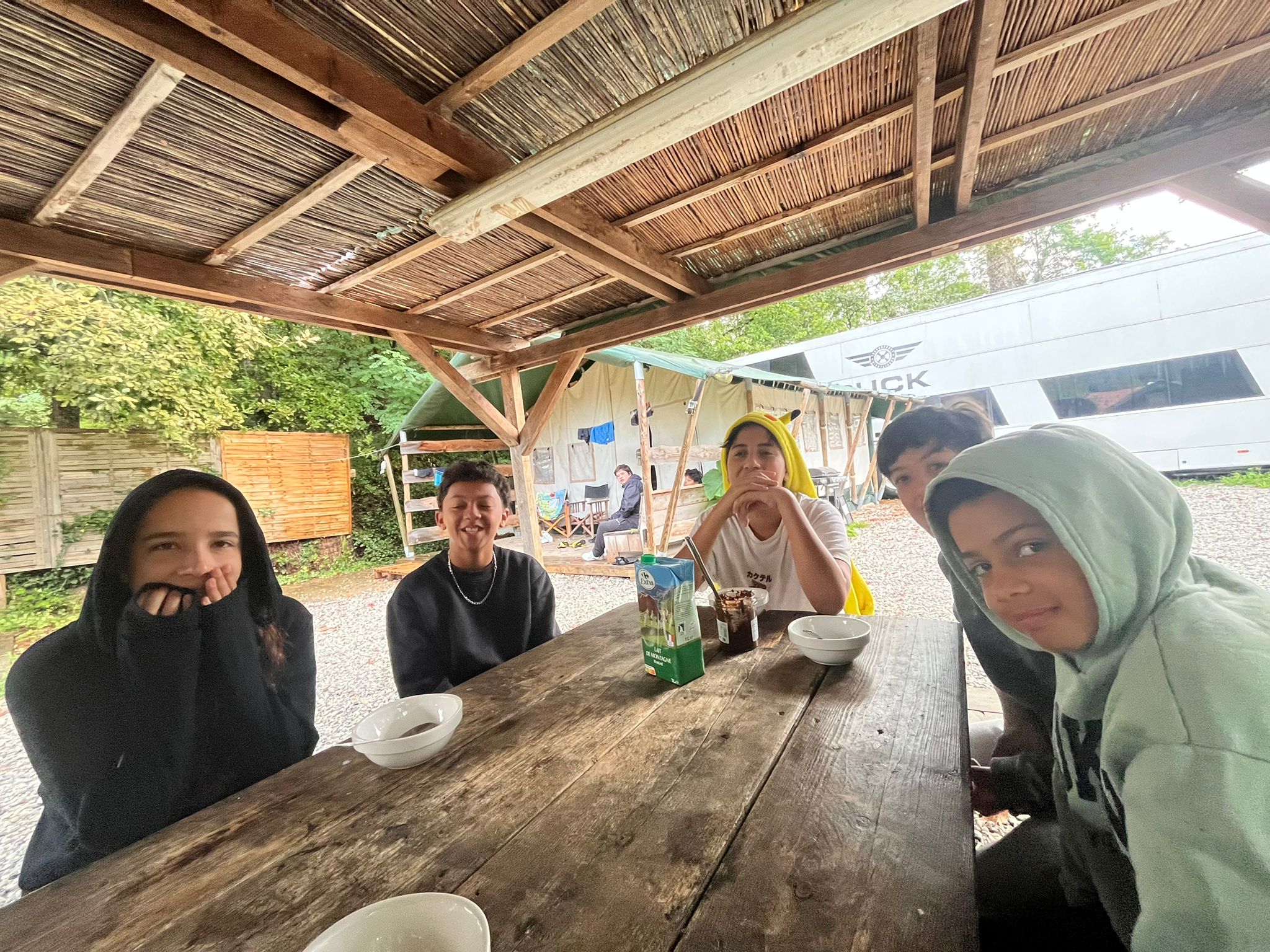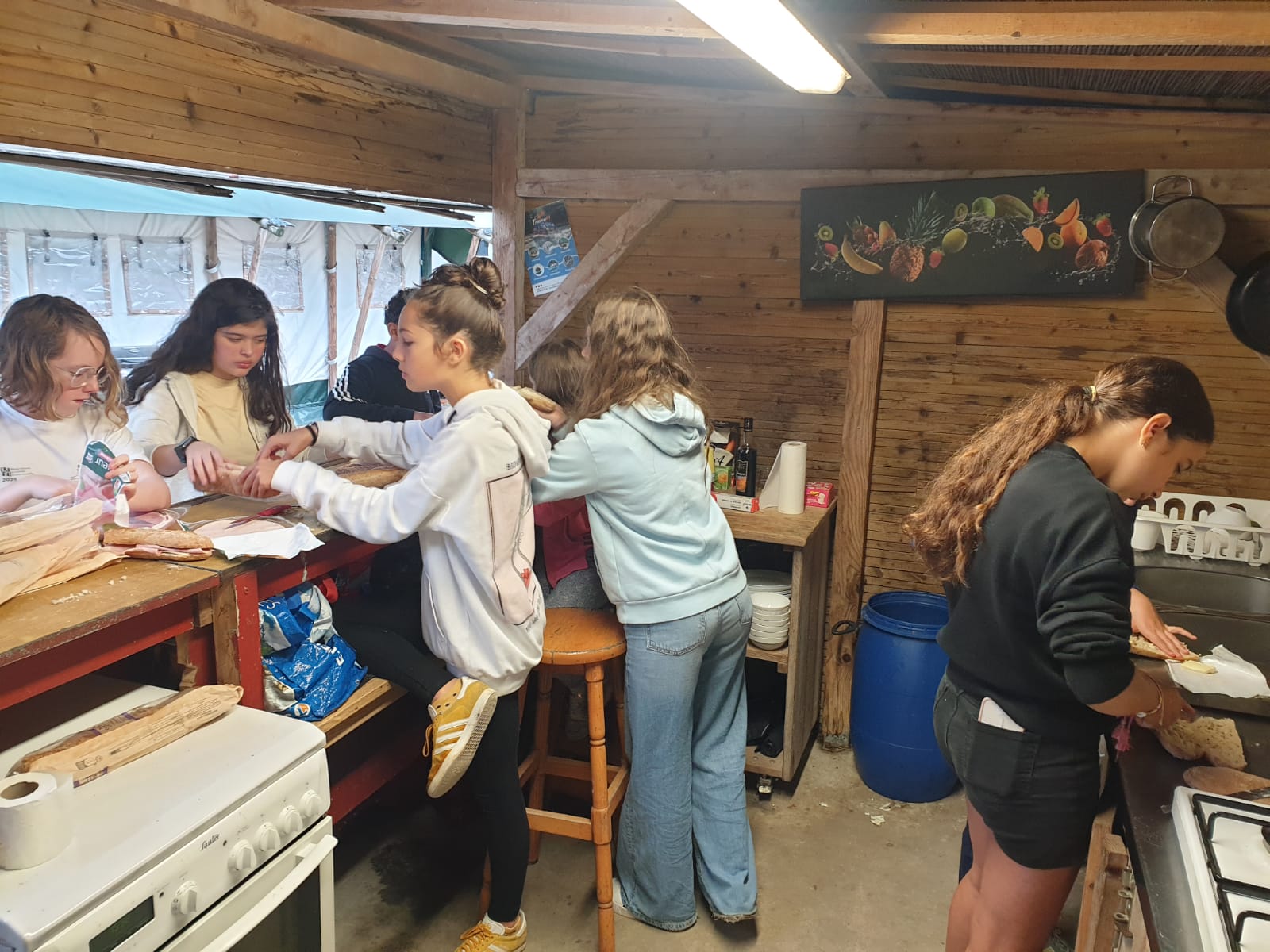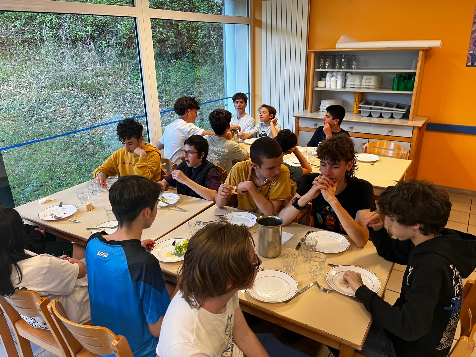 Nous sommes arrivés vers 11 heures ce matin au Camp de l’Évasion 64. Après nous être installés, nous avons enchaîné directement avec une session de rafting ! Ensuite, douche pour tout le monde, puis préparation du repas : salade de pâtes et salade de fruits. La météo n’étant pas clémente, nous n’avons pas pu nous rendre aux fêtes d’Itxassou. Au programme à la place : une séance de cinéma sous tente avec le film « Un petit truc en plus » !